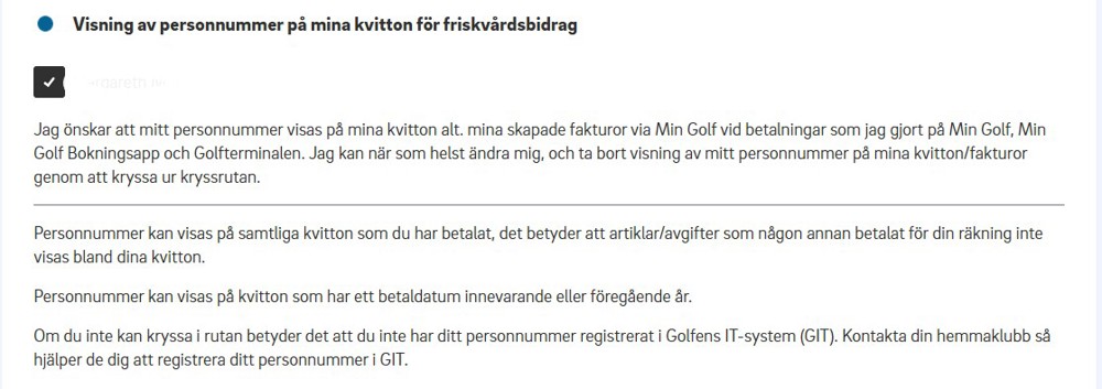 En kryssruta som gör det möjligt för dig att aktivera att att ditt personnummer visas på alla kvitton där betalningen skett via Min Golf..