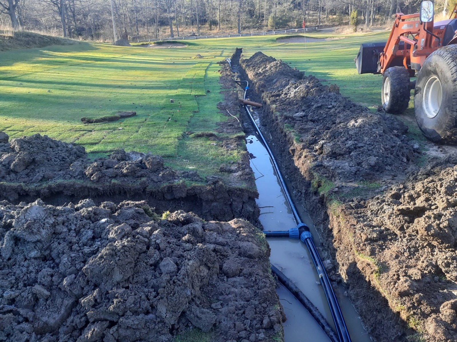 Båda bunkrarnas dräneringar kopplades ihop med den nya dräneringen som vi grävde i mitten av hela fairway för att få bukt med stående vatten på fairway.
