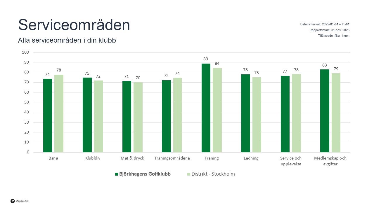 Varje område ges ett värde mellan 0-100 utifrån medlemmarnas satta betyg. Totalt sett gav ni medlemmar Björken snittvärdet 77 och det var en punkt bättre än vad snittet låg på i hela Stockholmsdistriktet (se bild).